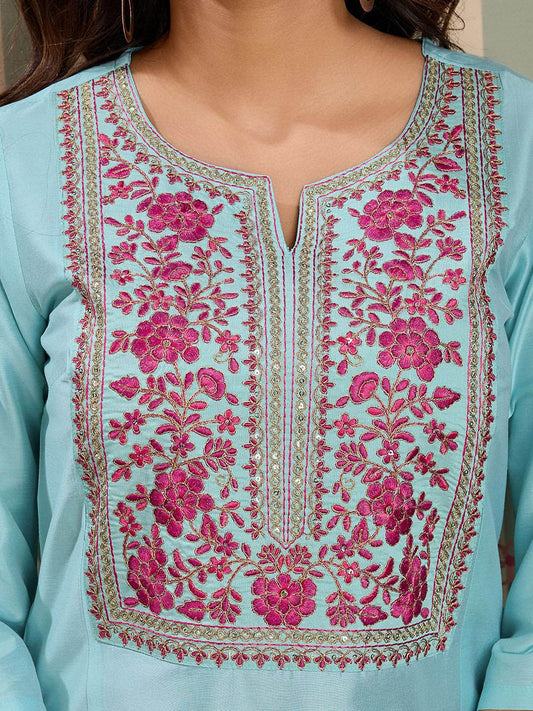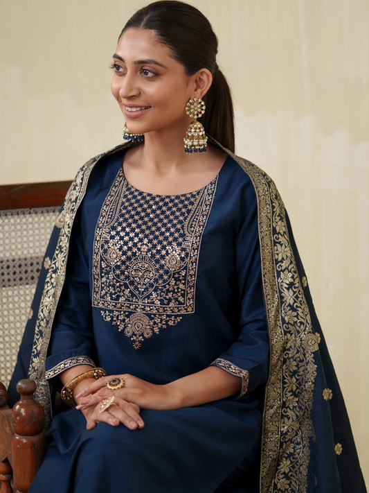 Dhiyona OD Floral Embroidered Notch Neck Kurta With Trousers And Dupatta