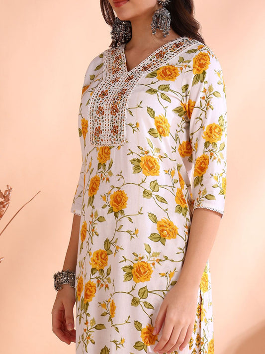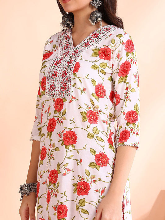 Dhiyona OD Round Neck Floral Regular Thread Work Pure Cotton Kurta Set