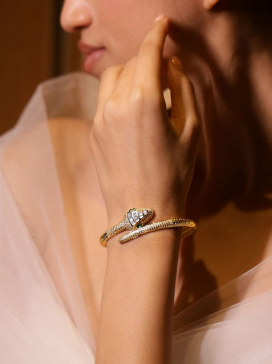 Dhiyona RJ Women's 22K Gold Plated Emerald & Cubic Zirconia Snake Design Demi Fine Openable Bracelet