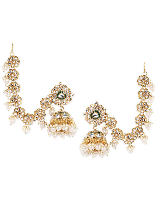 Dhiyona RJ Women's 22K Gold Plated Kundan Crystal Kan Chain Earrings with Pearls & Green Enamel Detail