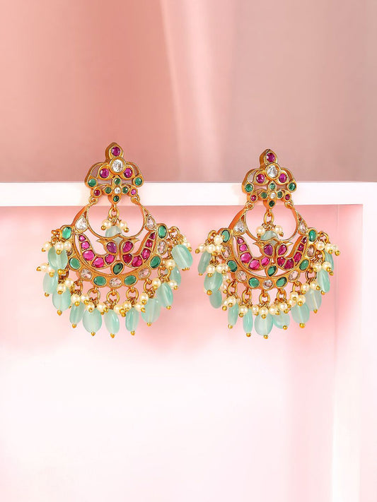 Dhiyona RJ Women's 22K Gold-Plated Ruby & Emerald Stone Studded Mint Green Beaded Chandbali Earrings