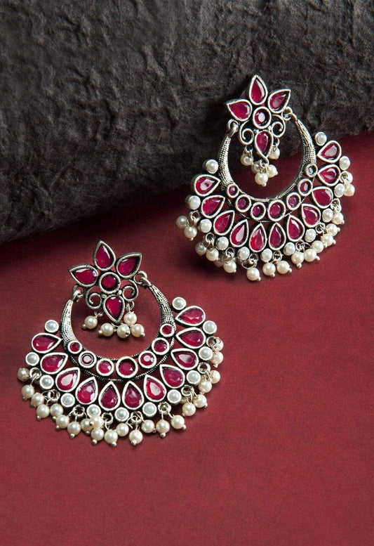 Dhiyona RJ Women's Oxidised Silver Plated Ruby & Pearl Studded Traditional Chandbali Earrings