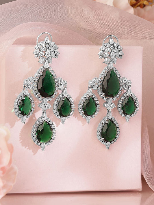 Dhiyona RJ Women's Rhodium-Plated Emerald Green & Cubic Zirconia Studded Premium Drop Earrings