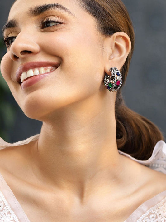 Dhiyona RJ Women's Black-Toned Multicolour Gemstone & Cubic Zirconia Studded Statement Hoop Earrings