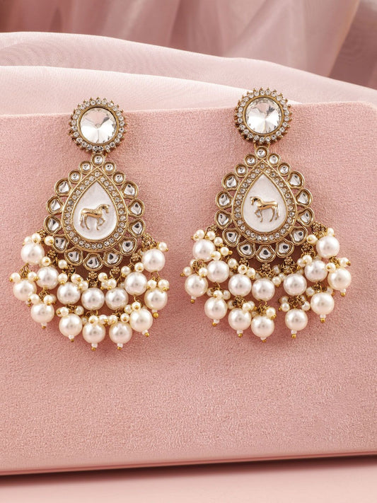 Dhiyona RJ Women's Off-White Gold-Plated Kundan-Studded Long Chandbalis with Pearl-Beaded