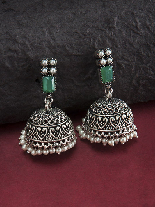 Dhiyona RJ Women's Silver-Toned & Green Dome Shaped Handcrafted Jhumkas