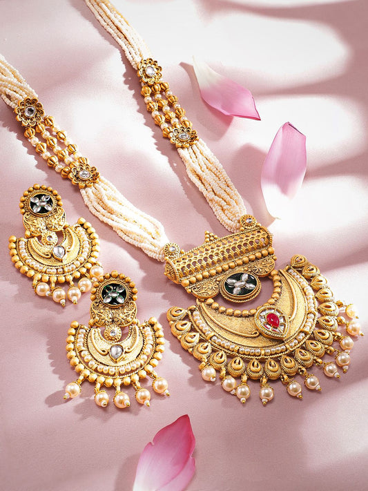 Dhiyona RJ Women's 22K Gold Plated Ruby,Emerald Kundan Studded Pearl & Gold Beaded Jewellery Set