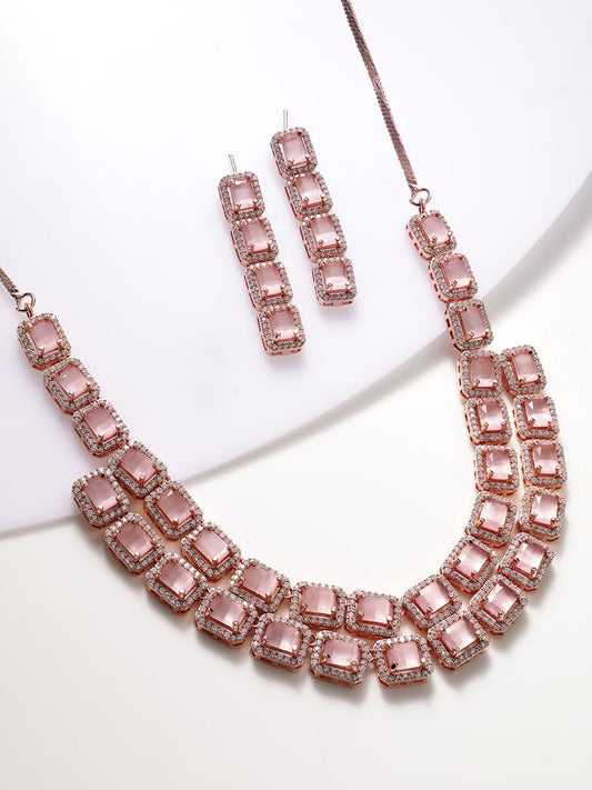Dhiyona RJ Women's Rhodium-Plated Pastel Pink AD & Cubic Zirconia Studded Necklace Set