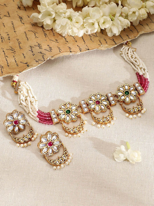 Dhiyona RJ Women's 22K Gold-Plated Pearl Beaded Multi-Strand Choker Set with Kundan & Floral Motifs