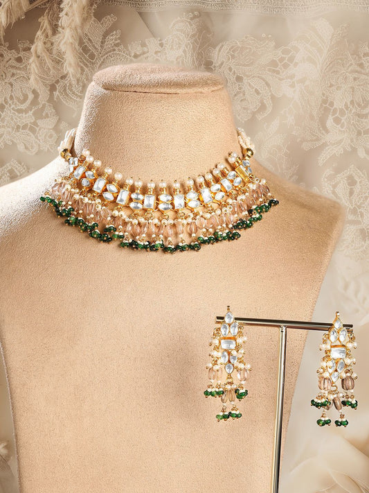 Dhiyona RJ Women's 24K Gold-Plated Pachi Kundan Choker Set with Light Gold Beads & Green Accents