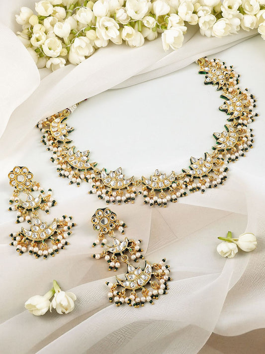 Dhiyona RJ Women's 22K Gold-Plated Kundan Studed Green Border, Pearl Beaded Crescent Moon Necklace Set