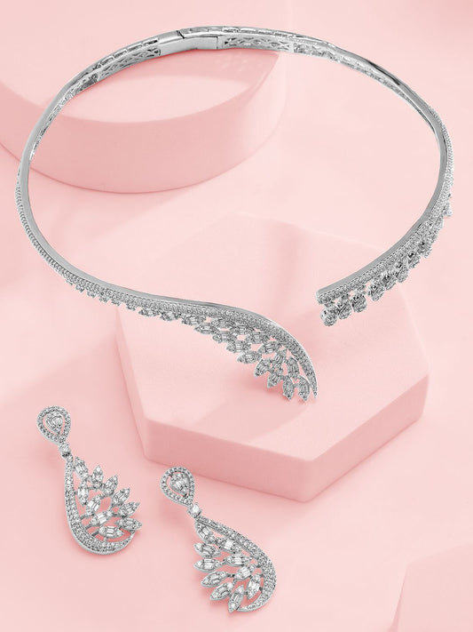 Dhiyona RJ Women's Silver-Plated AAA Cubic Zirconia Studded Leaf-Inspired Statement Choker NecklaceSet