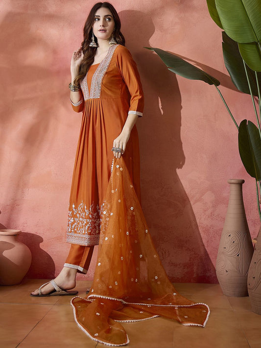 Dhiyona SN Women's Orange Floral Embroidered Pleated Thread Work A-Line Kurta With Trouser & Dupatta