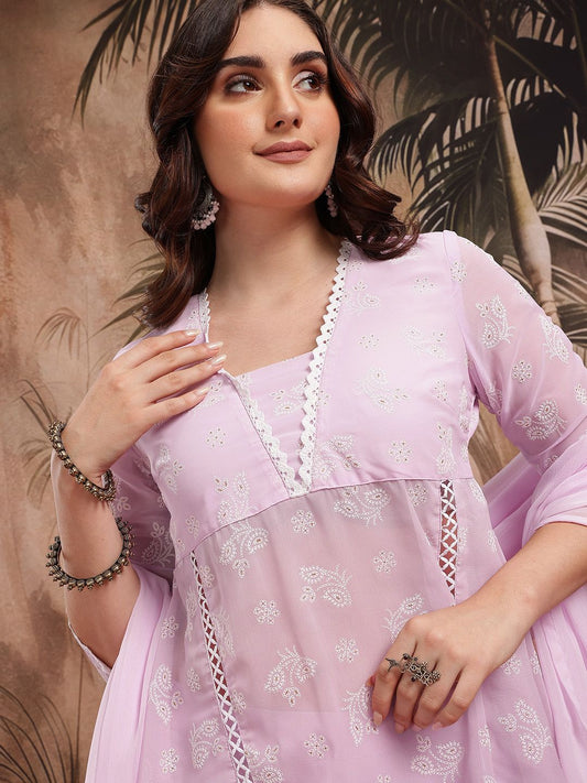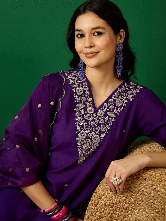 Buy 2 Get 1 FreeVendor:Dhiyona SNDhiyona SN Women's Purple Floral Embroidered V-Neck Sequinned Straight Kurta With Trouser & Dupatta