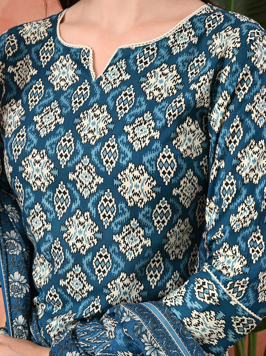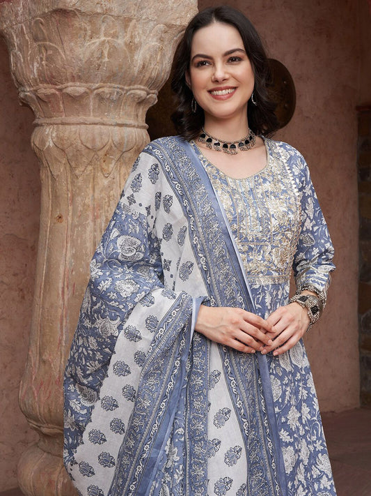 Dhiyona SN Women's Blue Printed Thread Work Pure Cotton Empire A-Line Kurta with Trousers & Dupatta