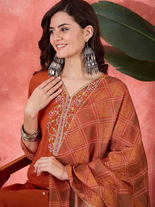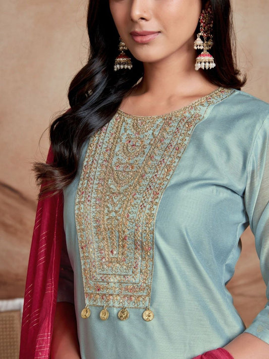 Dhiyona SN Women's Embroidered Round Neck Straight Kurta With Trousers & Dupatta