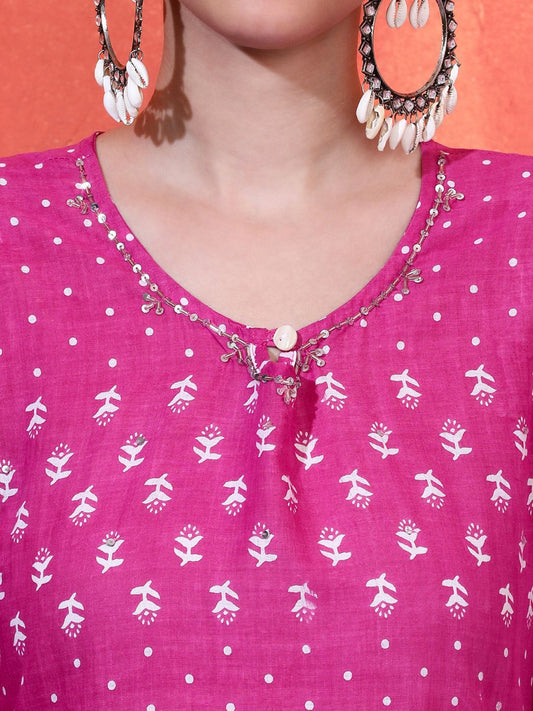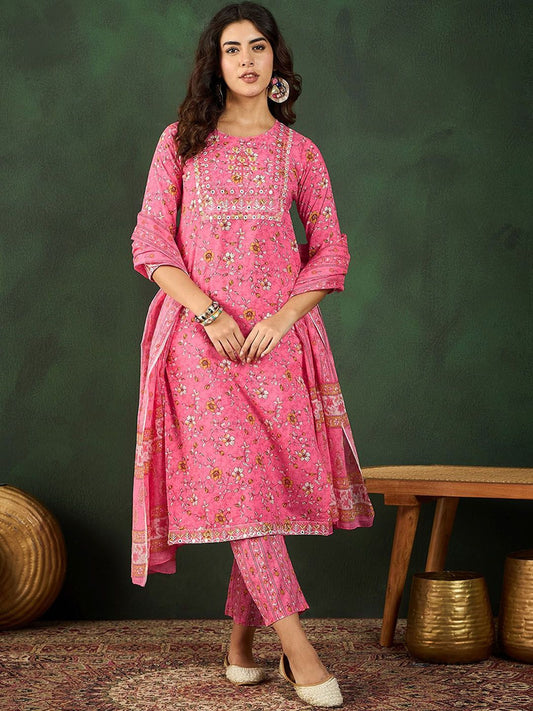 Dhiyona SN Women's Pink Floral Printed Mirror Work Pure Cotton A-Line Kurta Set