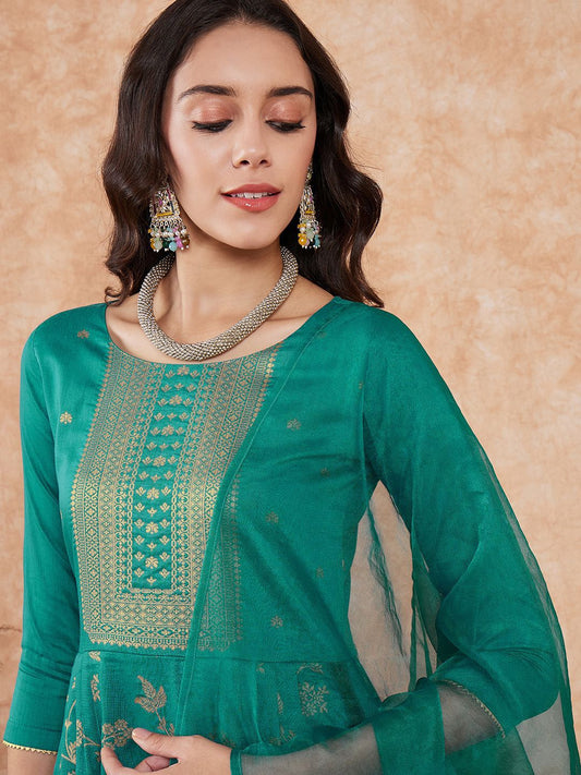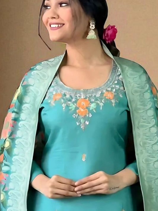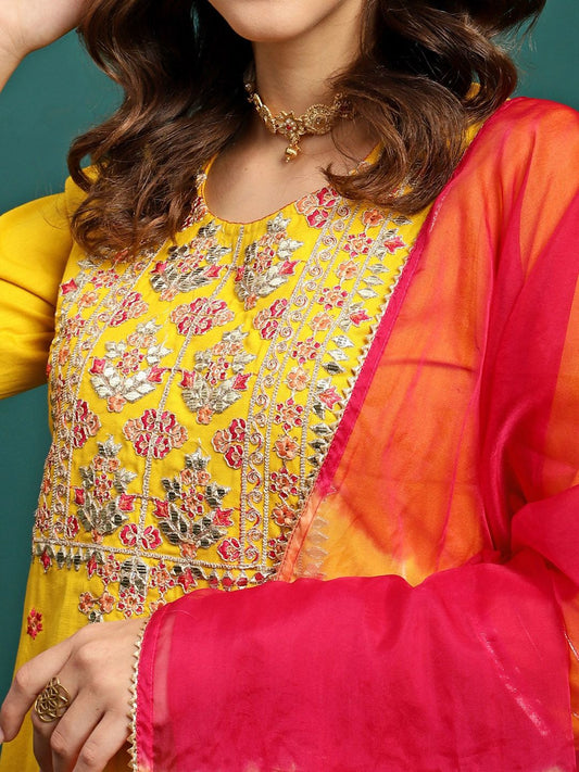 Dhiyona SN Women's Floral Embroidered Sequinned Chanderi Silk Straight Kurta & Palazzo With Dupatta