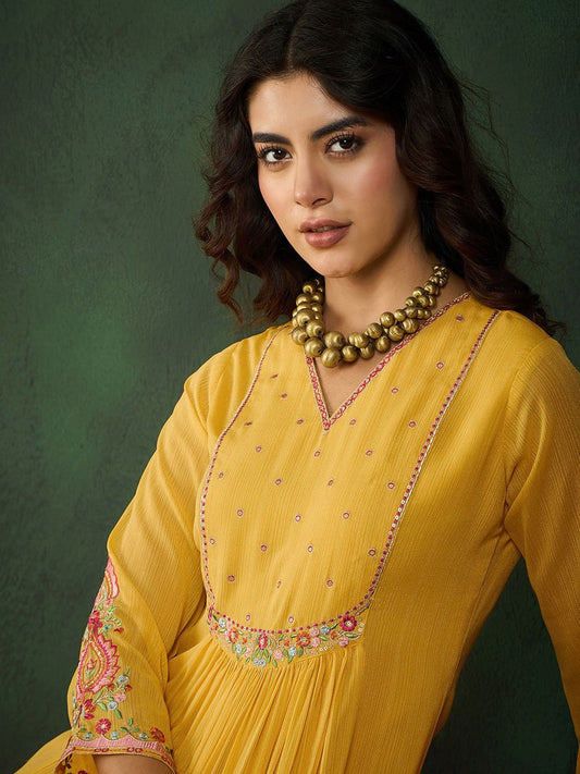 Buy 2 Get 1 FreeVendor:Dhiyona SNDhiyona SN Women's Orange Floral Embroidered Pleated Thread Work A-Line Kurta With Trouser & Dupatta