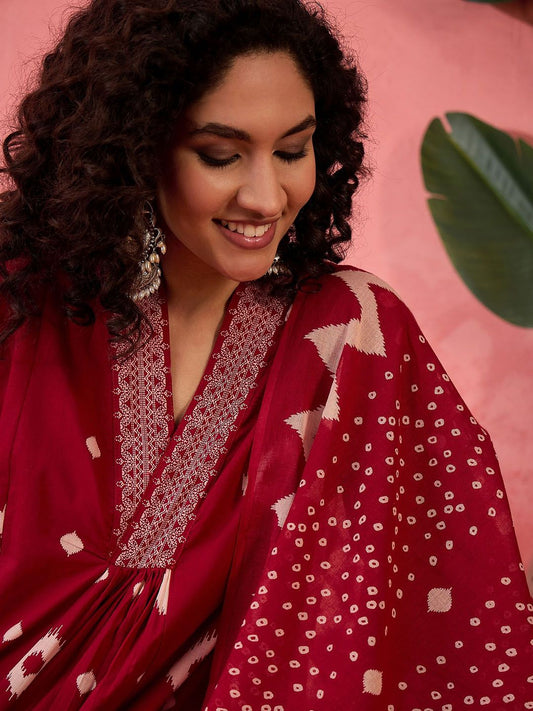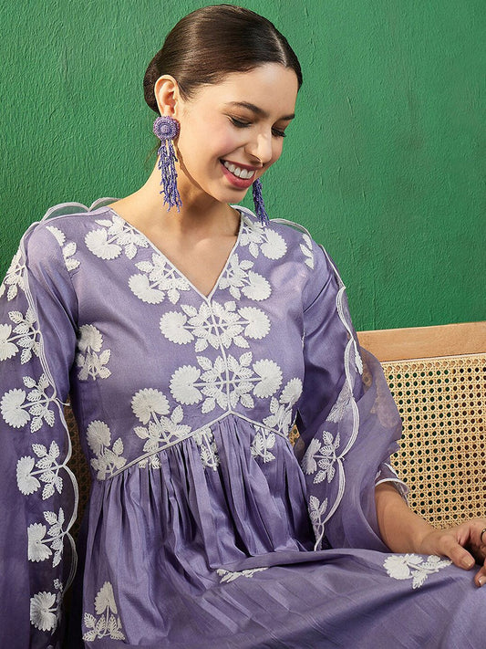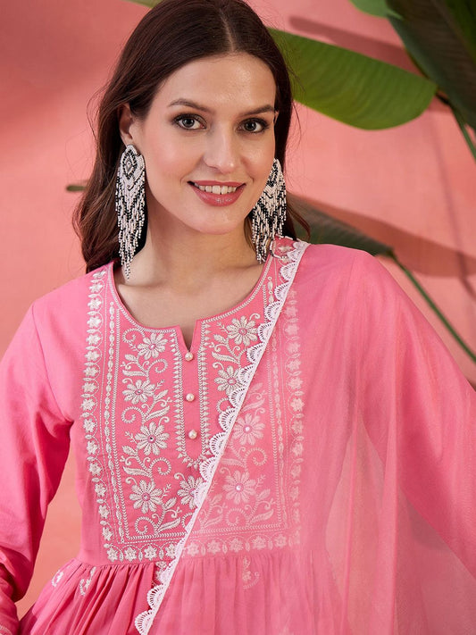Dhiyona SN Women's Thread Embroidered Pure Cotton Anarkali Kurta With Trousers & Dupatta