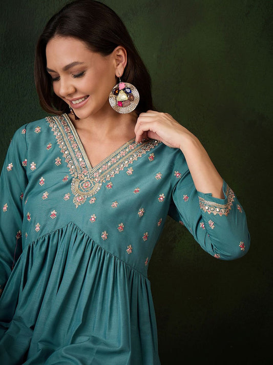 Dhiyona SN Women's Floral Embroidered V-Neck Mirror Work A-Line Kurta With Palazzo