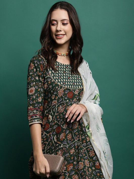 Dhiyona SN Women's Floral Printed Pure Cotton Anarkali Kurta With Trouser And Dupatta