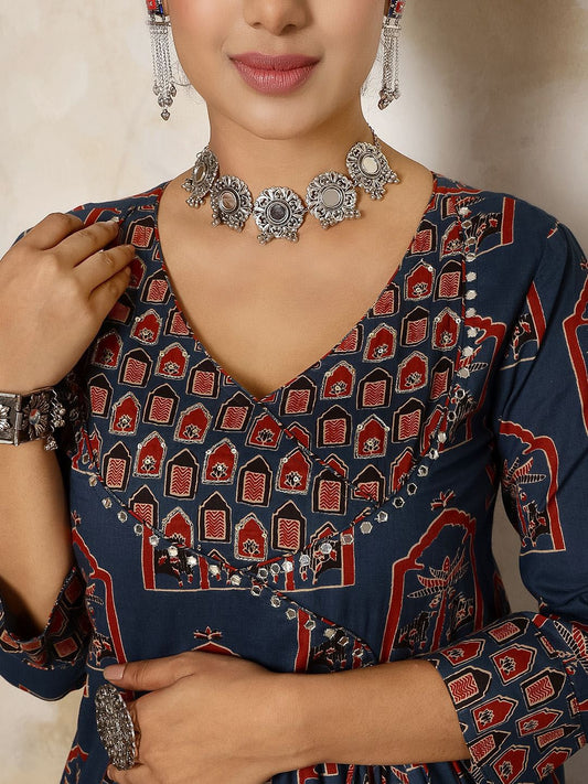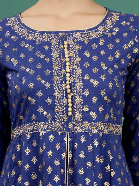 Dhiyona SN Women's Blue Floral Embroidered Pure Cotton A-Line Kurta & Trousers With Dupatta
