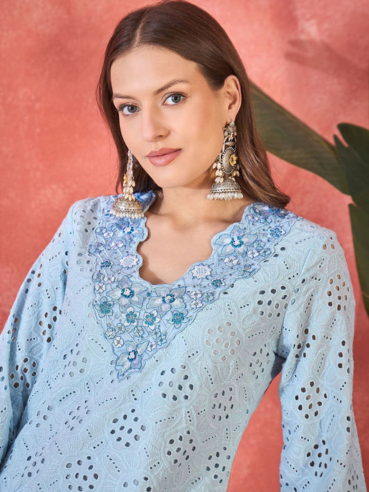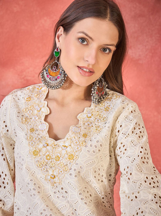 Dhiyona SN Women's Floral Schiffli Embroidered Thread Work Pure Cotton Straight Kurta With Trousers