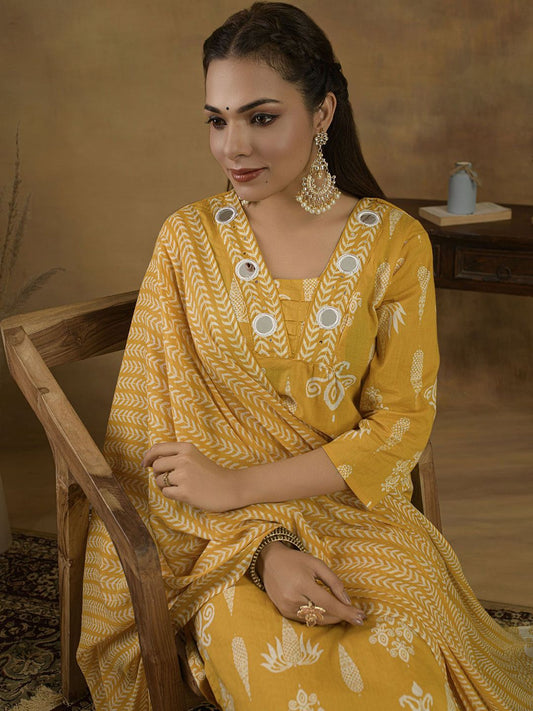 Dhiyona SN Women's Ethnic Motifs Printed Regular Mirror Work Pure Cotton Kurti set