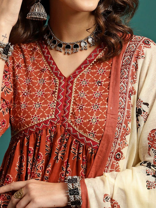 Dhiyona SN Women's Geometric Printed V-Neck Pleated Pure Cotton A-Line Kurta With Trouser And Dupatta