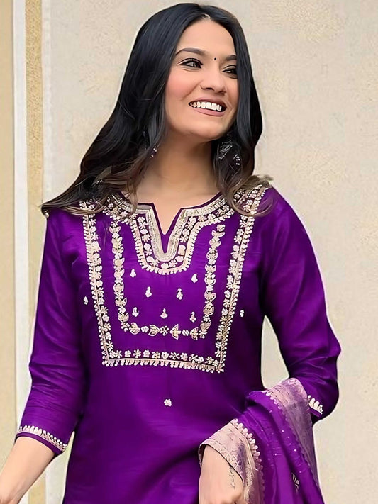 Dhiyona SN Women's Zari Sequence Embroidered Straight Kurta Trousers With Dupatta