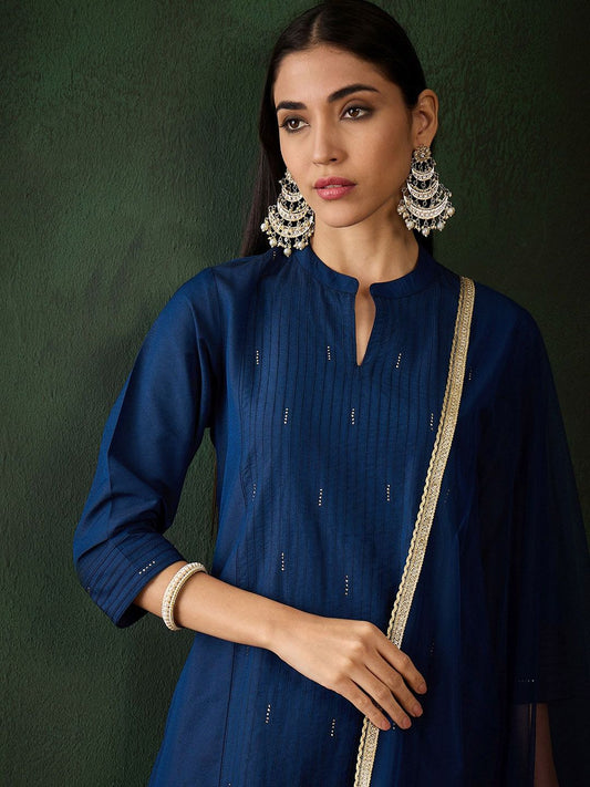 Buy 2 Get 1 FreeVendor:Dhiyona SNDhiyona SN Women's Navy Blue Stripped Self Design Pintuck Pure Cotton Kurta & Trouser With Dupatta