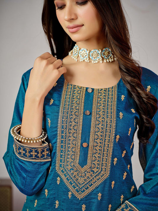 Dhiyona SN Women's Blue Ethnic Motifs Embroidered Kurta with Churidar & Dupatta