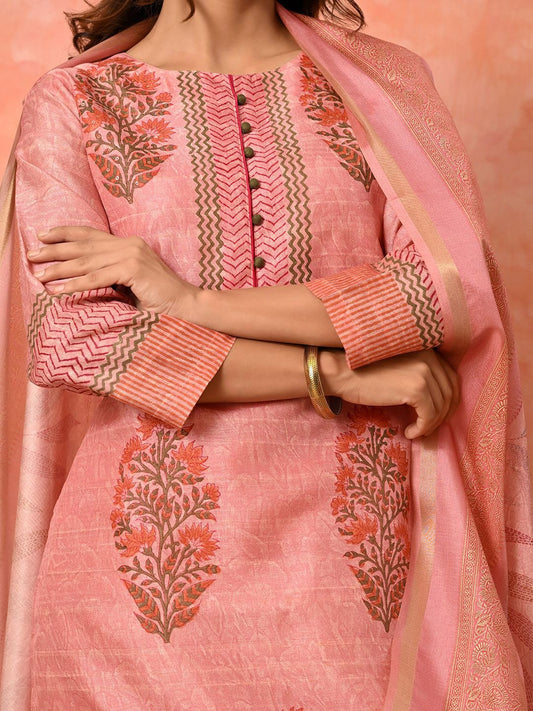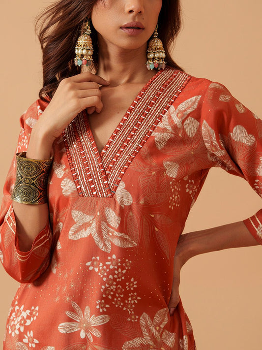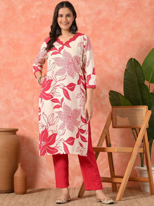 Dhiyona SN Women's Floral Printed Chanderi Cotton V-Neck Straight Kurta With Trousers