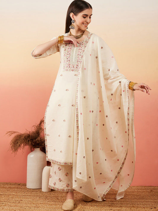 Dhiyona SN Women's Floral Embroidered Pure Cotton Straight Kurta With Palazzo & Dupatta