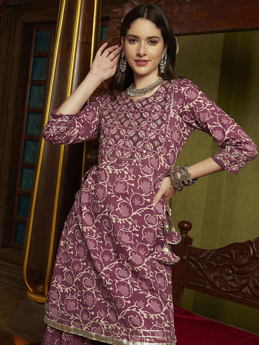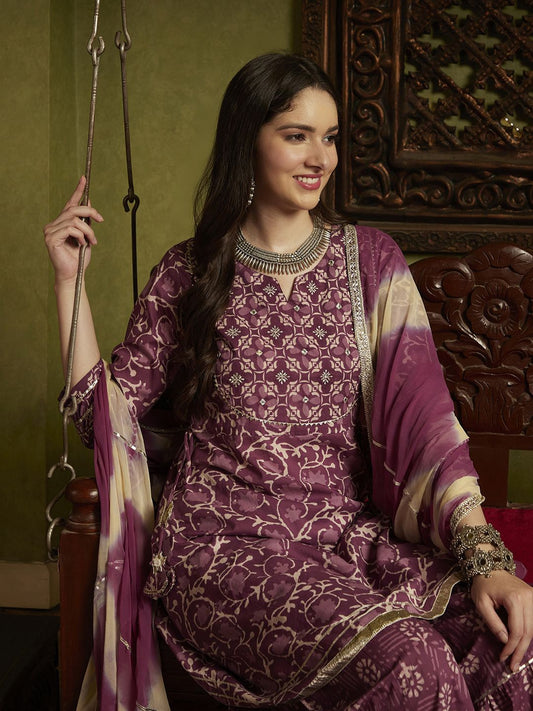 Dhiyona SN Women's Purple Floral Printed Notch-Neck Pure Cotton A-Line Kurta With Sharara & Dupatta.