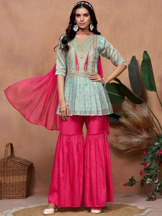 Dhiyona SN Women's Paisley Embroidered V-Neck Short Sleeves Chanderi Silk Kurta & Sharara & Dupatta