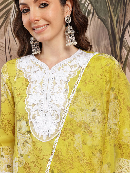 Dhiyona SN Women's Floral Yoke Design Thread Work A-Line Kurta With Trouser And Dupatta