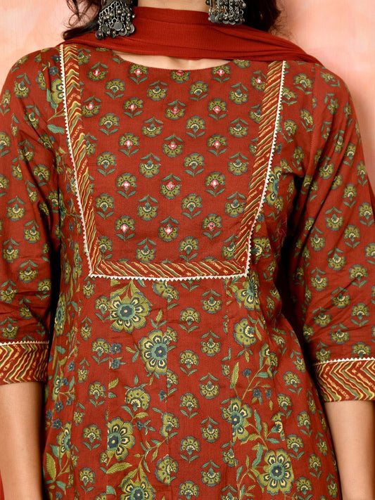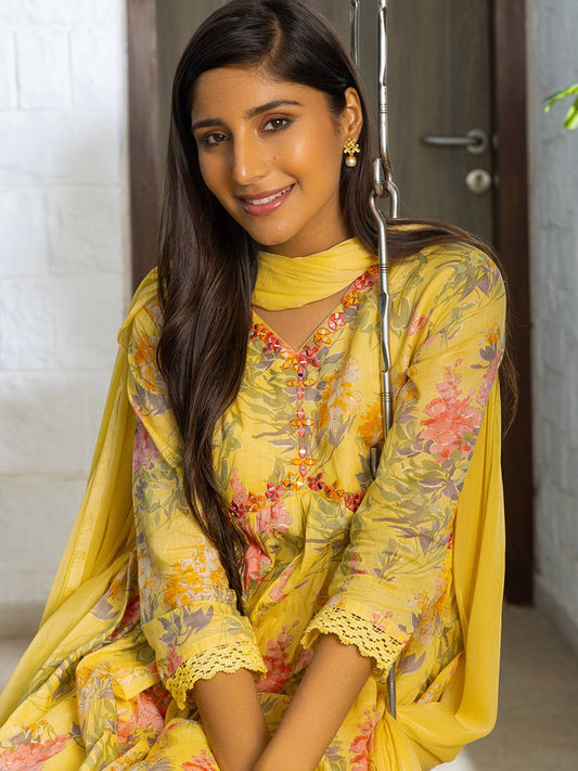 Dhiyona SN Women's Alia Cut Floral Printed Mirror Work Pure Cotton A Line Kurta With Trousers & Dupatta
