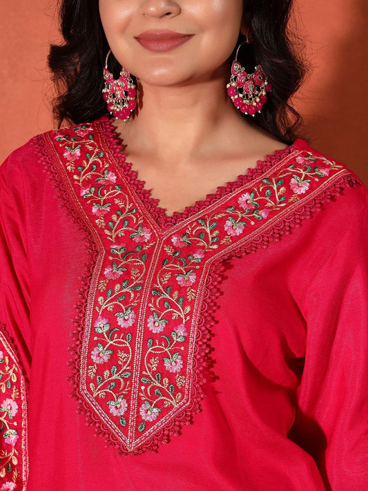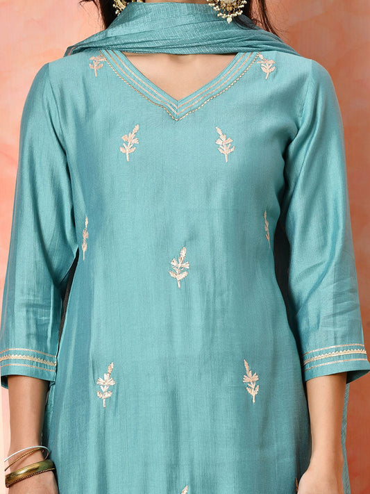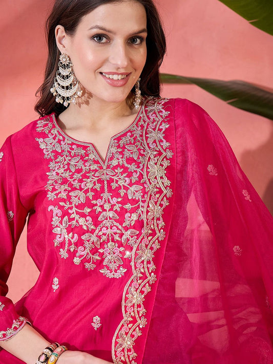Dhiyona SN Women's Floral Embroidered Notch Neck Zari Straight Kurta With Trouser & Dupatta