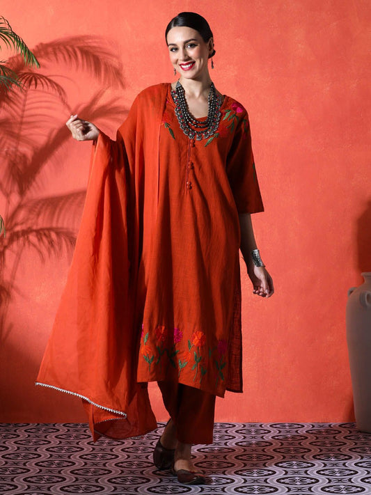 Dhiyona SN Women's Floral Embroidered Cotton Kurta with Trousers & Dupatta