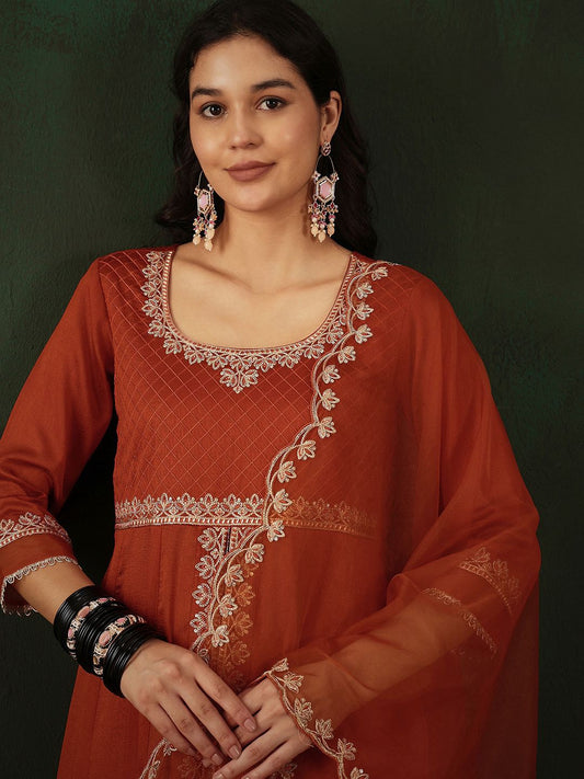 Dhiyona SN Women's Floral Yoke Design Panelled Thread Work A-Line Kurta With Trouser And Dupatta