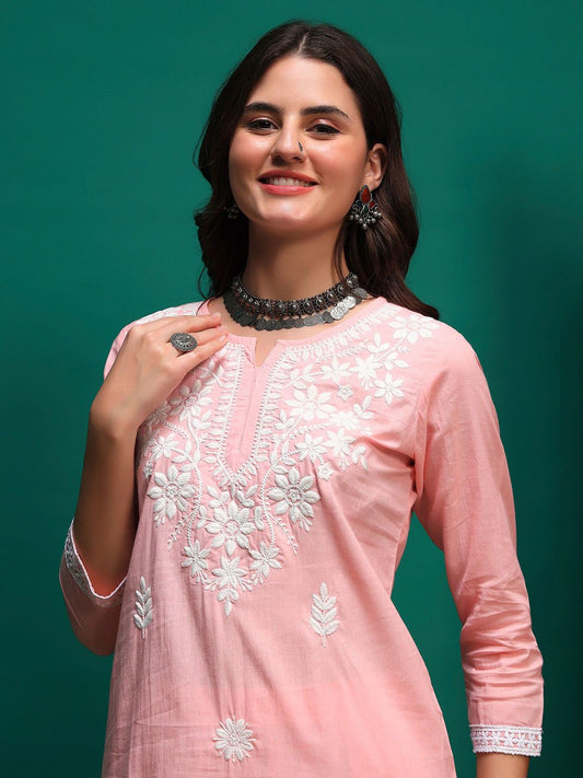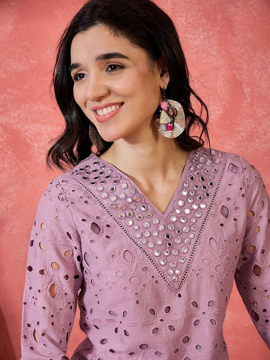 Dhiyona SN Women's Geometric Embroidered Mirror Work Pure Cotton Straight Kurta With Trousers