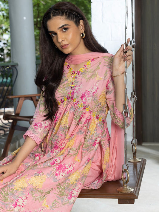 Dhiyona SN Women's Floral Printed Pure Cotton Round Neck Anarkali Kurta With Trouser And Dupatta