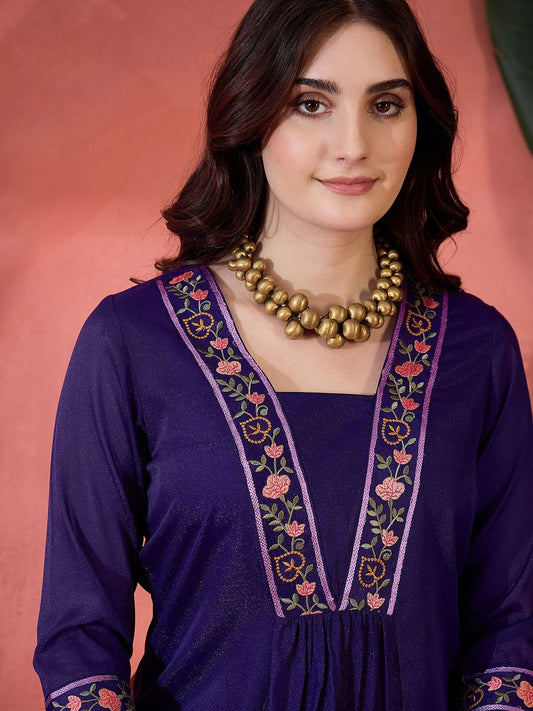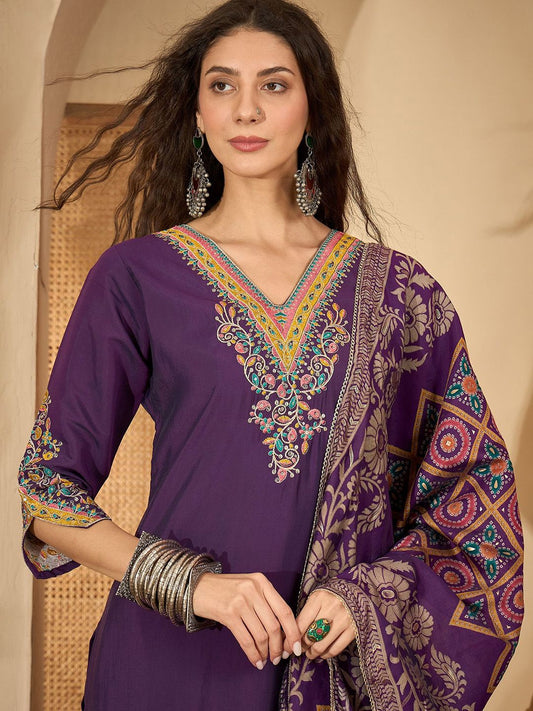 Dhiyona SN Women's Purple Floral Embroidered V-Neck Sequinned Straight Kurta With Trousers & Dupatta