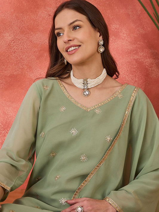 Buy 2 Get 1 FreeVendor:Dhiyona SNDhiyona SN Women's Parrot Green Floral Sequinned Round Neck Straight Kurta With Palazzos And Dupatta