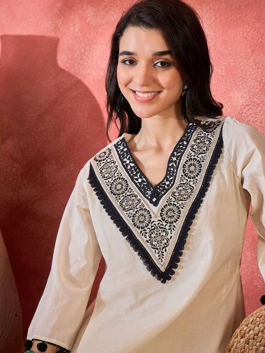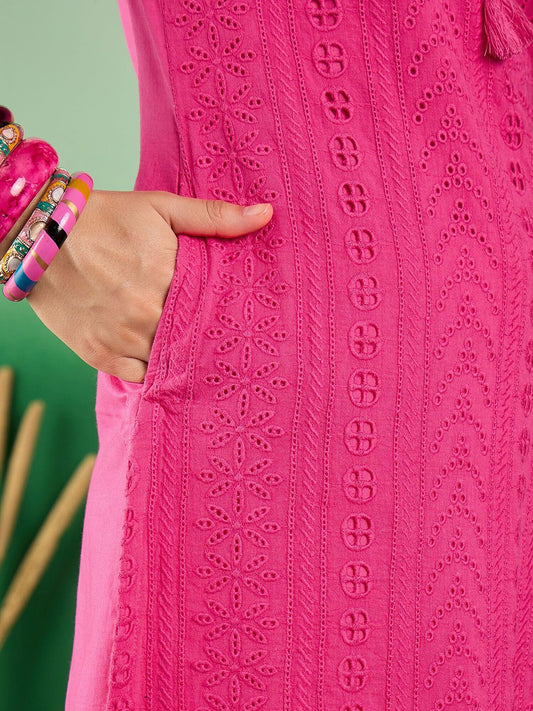 Dhiyona SN Women's Self Design Schiffli Tie-Up Neck Pure Cotton Kurta With Trousers & Dupatta