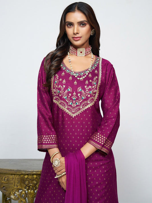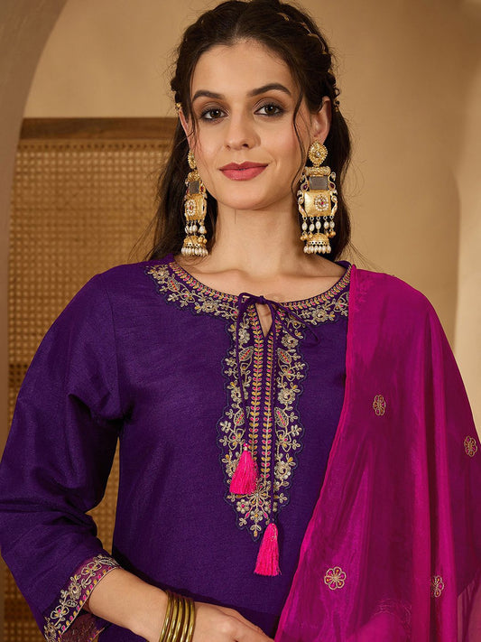 Dhiyona SN Women's Embroidered Round Neck Straight Kurta & Sharara With Dupatta