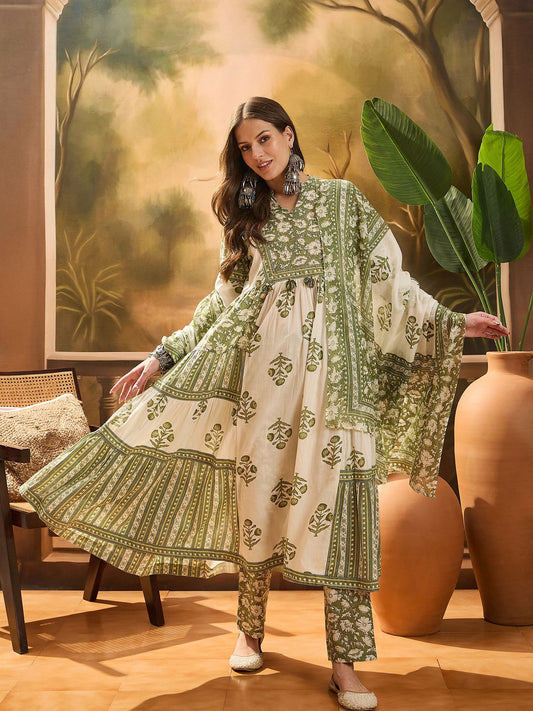 Dhiyona SN Women's Women's Pista Green Block Printed Cotton Anarkali Kurta Pant Dupatta Set