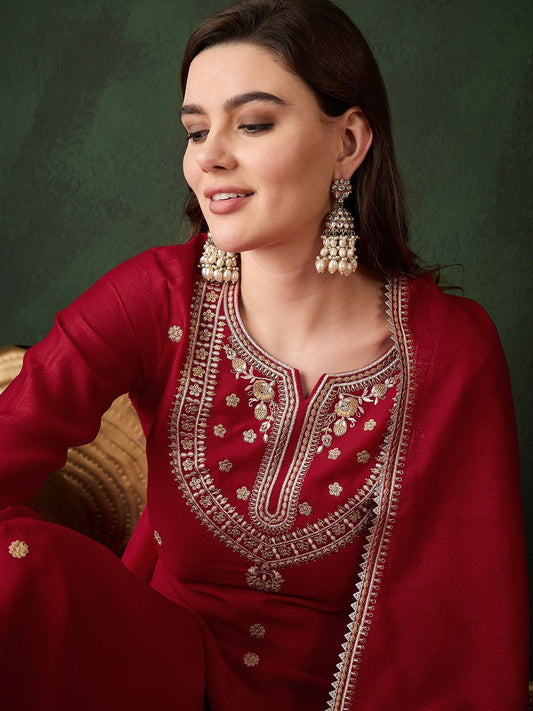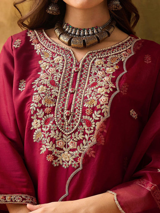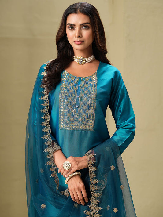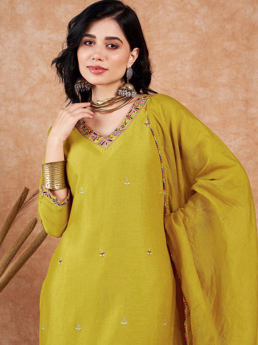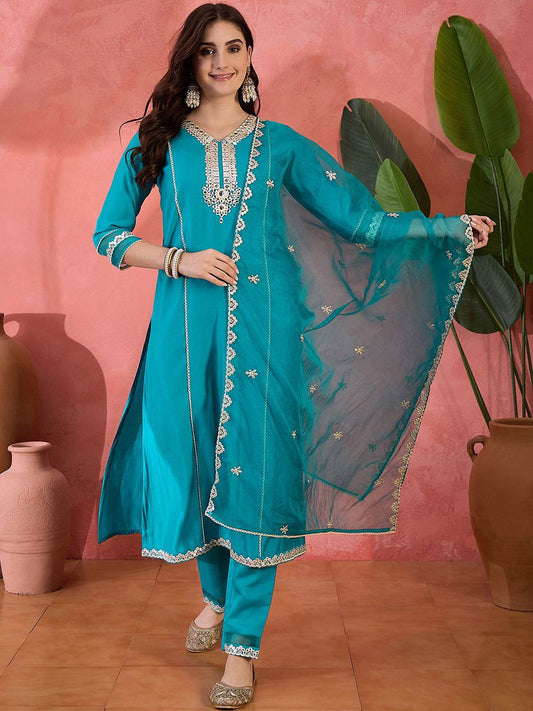Dhiyona SN Women's Zari Sequin & Mirror Work Embroidered Straight Kurta & Trousers With Dupatta